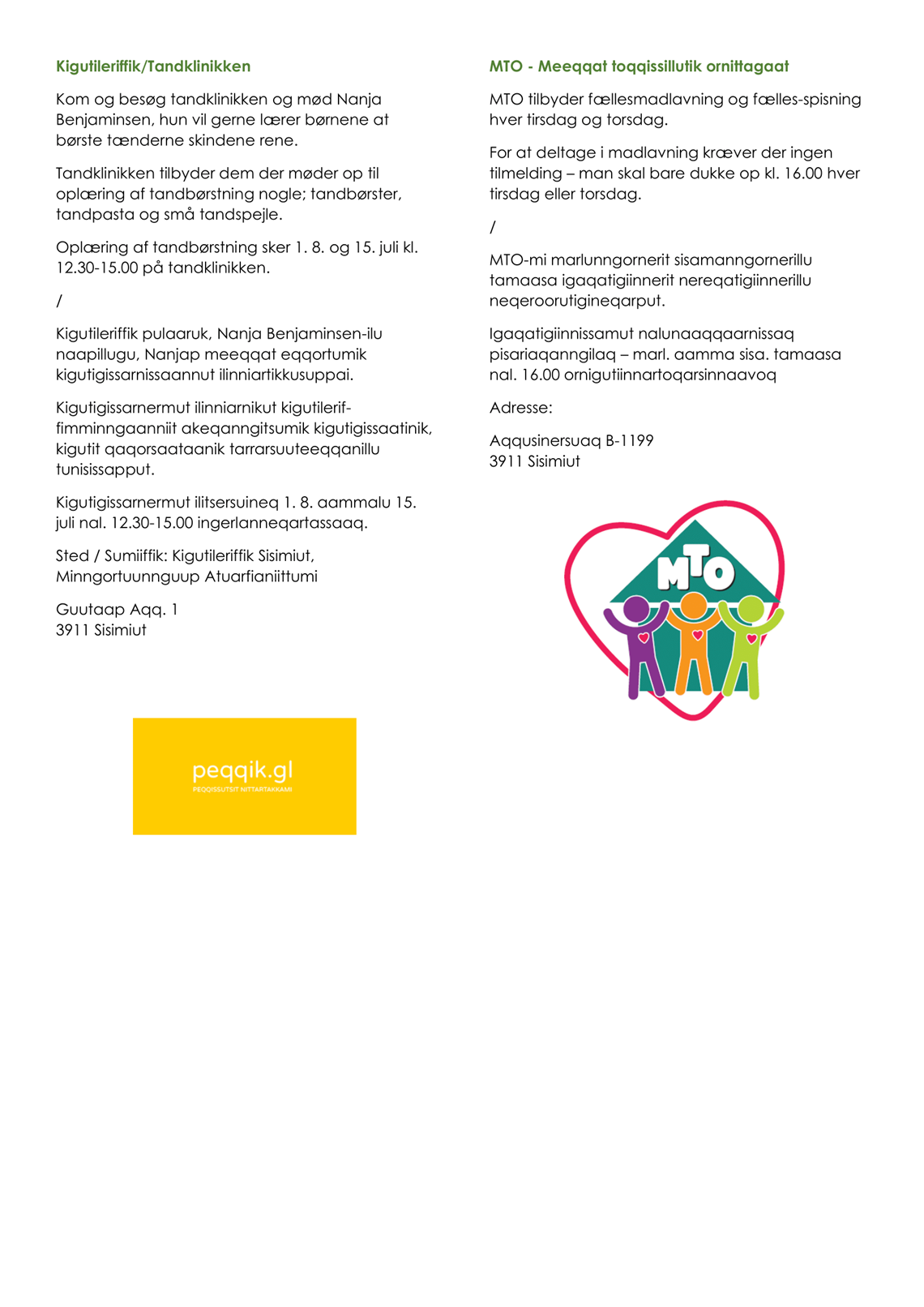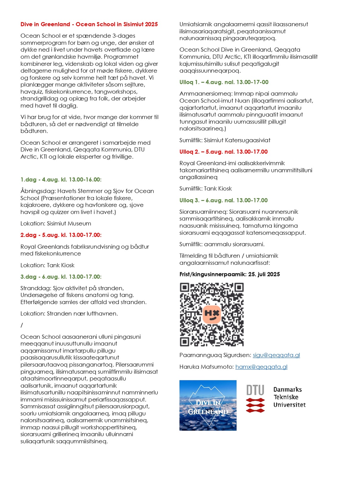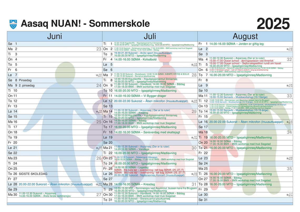 Derfor har vi lavet et samarbejdsgruppe med forskellige virksomheder - og frivillige arrangører denne sommer. Vi har sat dato baseret på aktivitetsforslagene. I Aasaq NUAN! kalenderen – Sommerskole 2025 kan man se forskellige virksomheders arrangementer i bestemte dage og tidspunkter (Aasaq NUAN! - Sommerskole 2025 program), (Den endelige sommerskolekatalog 2025).