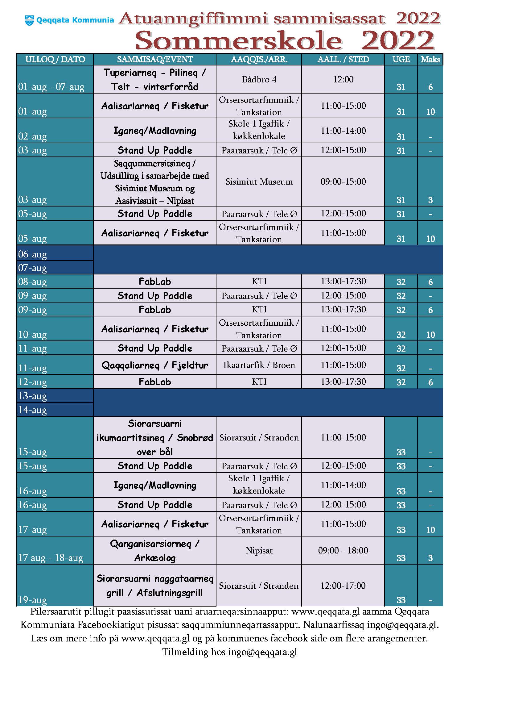 Piffissaq: 3. august, 5. august, 9. august, 11. august, 15. august aamma 17. august, nal. 12:00 – 15:00