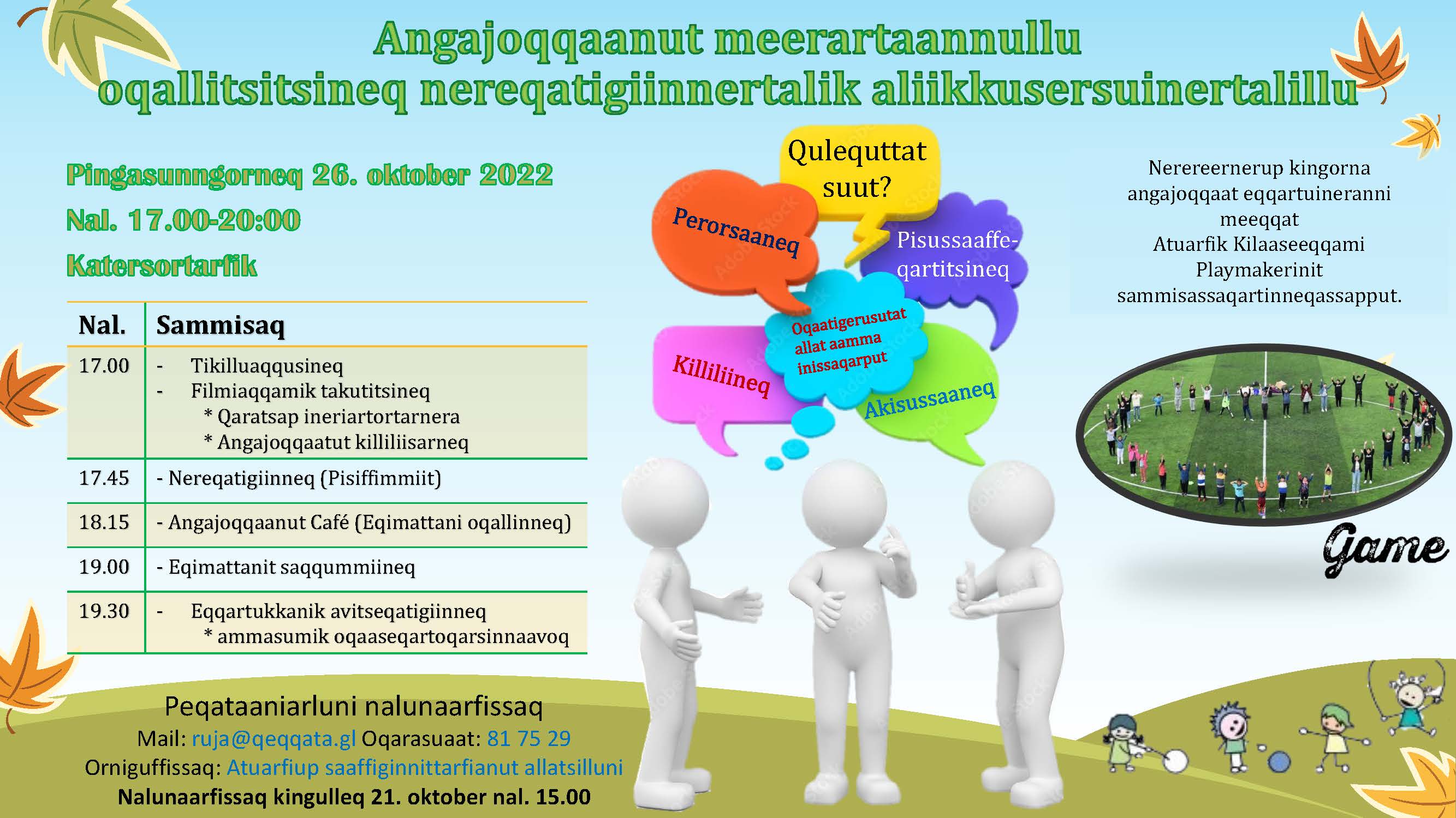 Inuunerissaarnermi gruppe 2 Angajoqqaatut akisussaarnermi suliniutillit angajoqqaanut meerartaannullu oqillitsitsineq nereqatigiinnertalik aliikkusersuinertalillu ingerlanneqassaaq pingasunngorneq 26. oktober nal. 17:00 Katersortarfimmi.