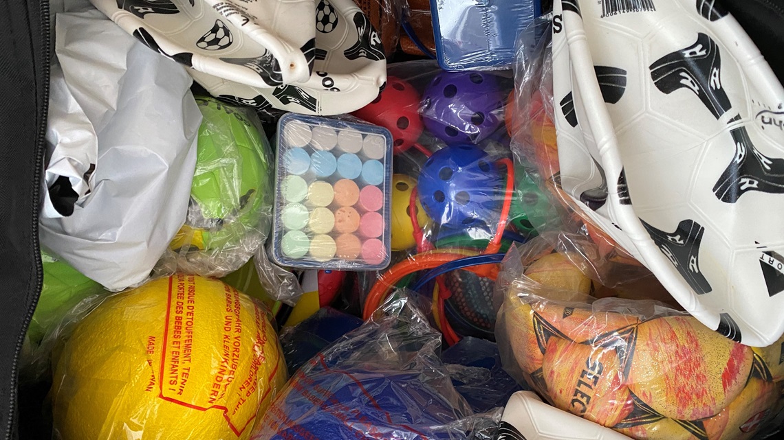 I en kasse er der bold, legetøj, kridt og meget mere.
