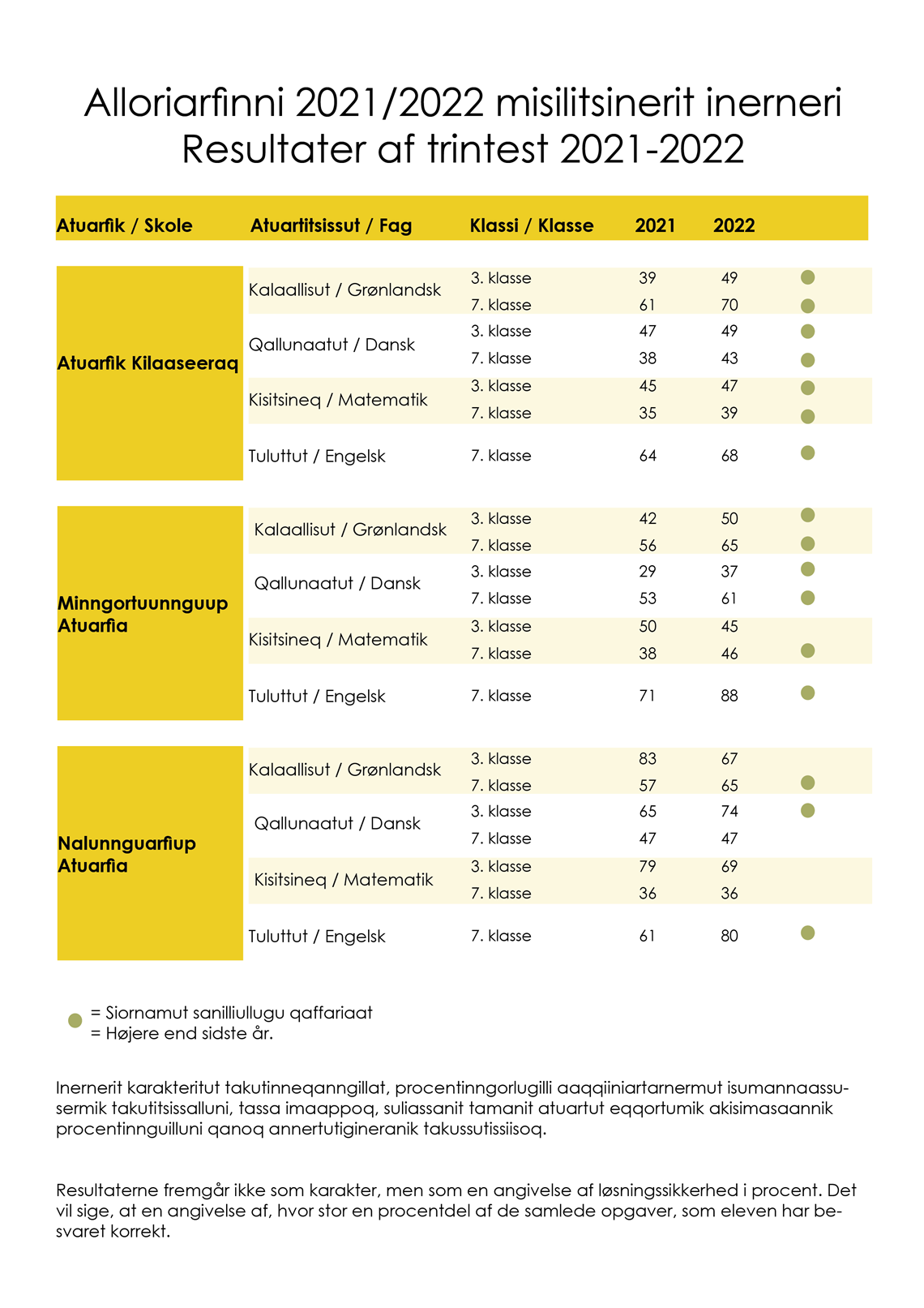 Meeqqat atuarfiisa pitsaassusaat pillugu nalunaarummik ukiut tamaasa oktobarip aallaqqataa nallertinnagu kommunalbestyrelsimut tunniussisoqartarpoq. Nalunaarutillu kingulliup takutippaa meeqqat 3. klassimi 7. klassimilu alloriarfinni siorna misilitsinneri siornaammut sanilliullugu qaffariarsimasut.