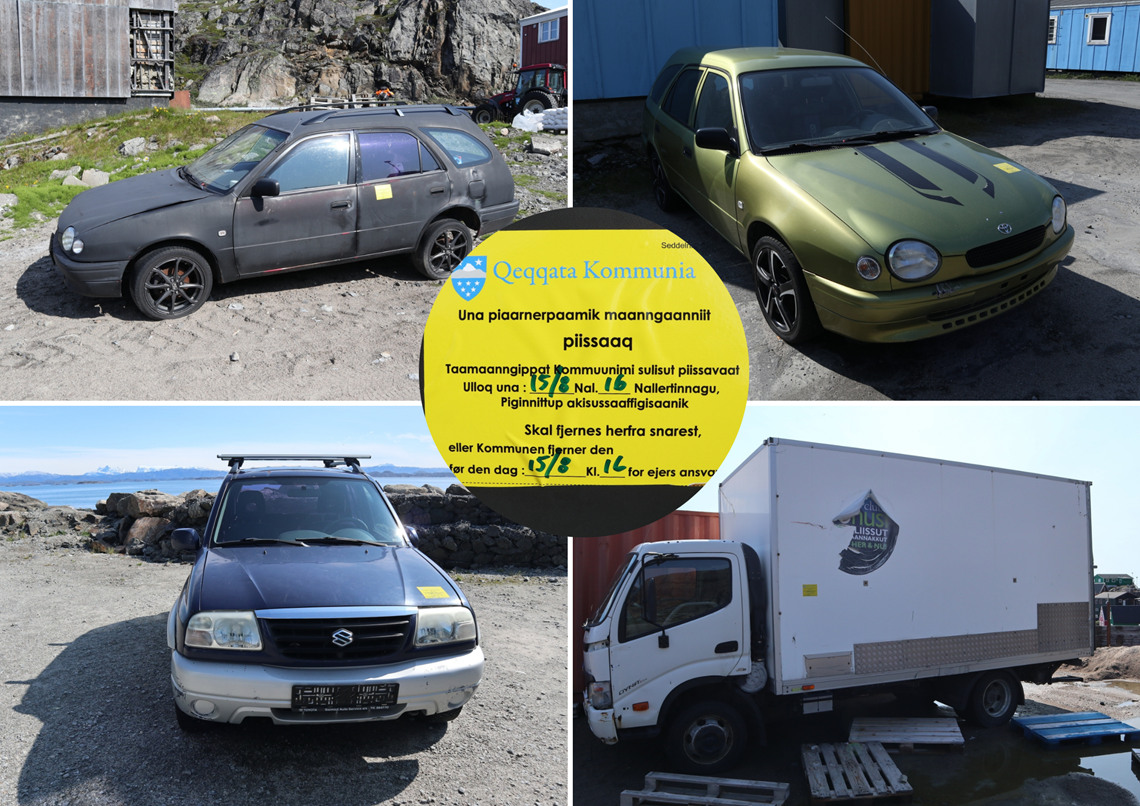 Genstande som vist på billederne beliggende i forskellige steder i Maniitsoq er påklistret med gulesedler. Genstandene flyttes til kommunens fremlysningsplads efter fristen er udløbet. Når fremlysningsperioden er slut efter 3 måneder, vil kommunen bortskaffe og eventuel sælge genstande for at dække udgifterne for fjernelsen, såfremt miljømyndigheden vurderer om genstande vurderes til at være affald/skrot.