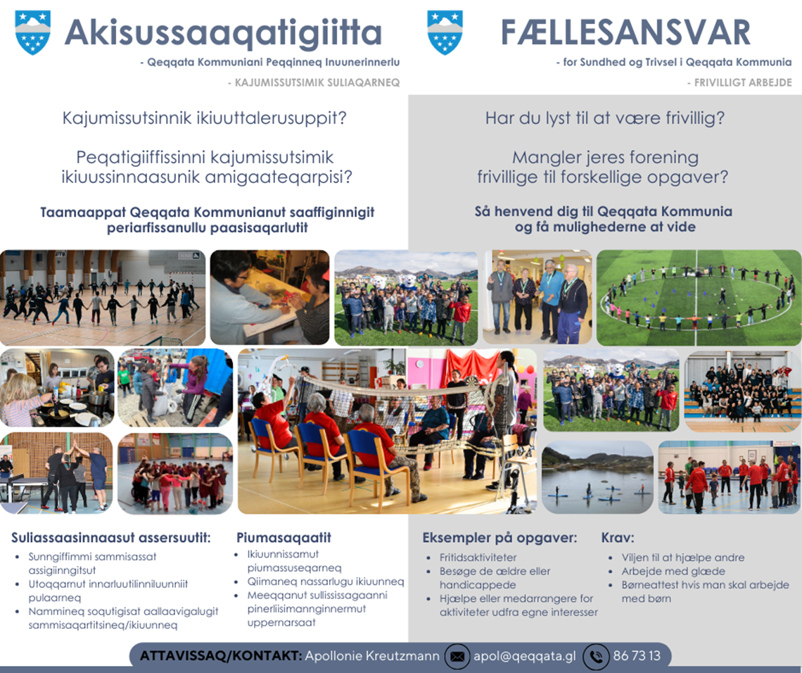 I den forbindelse vil Qeqqata Kommunia tydeliggøre mulighederne for frivillige opgaver i udgangspunkt i borgernes interesser. Dette vil foregå at kontakte Projektkonsulenten Apollonie Kreutzmann i Qeqqata Kommunia, hvor der samles og koordineres henvendelser fra foreningerne om hvilke poster der mangler frivillige og fra borgerne om hvilke opgaver de er interesseret i. Borgerne kan også henvende sig for vejledning om opstart af forening eller afholdelse af forskellige arrangementer, hvis de er i tvivl i at starte.