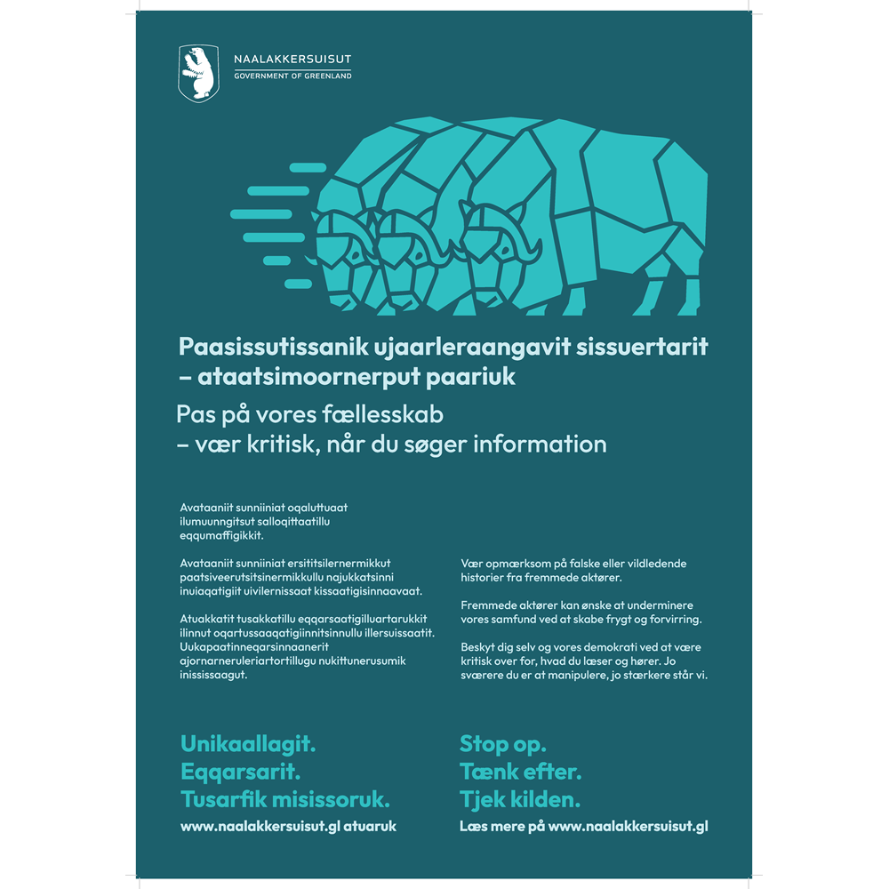 Vi må stå sammen mod påvirkningskampganer mod Grønland, og passe på vores demokrati. Derfor opfordrer Qeqqata Kommune alle borgere til at være opmærksomme, og hjælpe med at passe på vores fællesskab ved at forholde sig kritisk til den information, man møder.